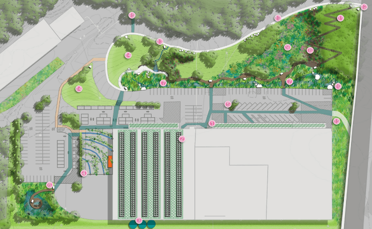The project is being completed in partnership with Union Collective ownership. It’s being managed by Ashley Traut, of Gaiacene Services LLC, and includes professional services by CityScape Engineering and the landscape design firm Rain Underground, LLC. The design team is exploring a number of proven green infrastructure solutions such as a large, constructed native meadow, bioretention systems, green roofs, cisterns and many new native trees and other plants. Also being explored are opportunities for making the Union Collective property as inviting and accessible as possible to pedestrian and bicycle traffic from the surrounding neighborhoods, and from the nearby light rail station. New connector trails and pathways are planned.