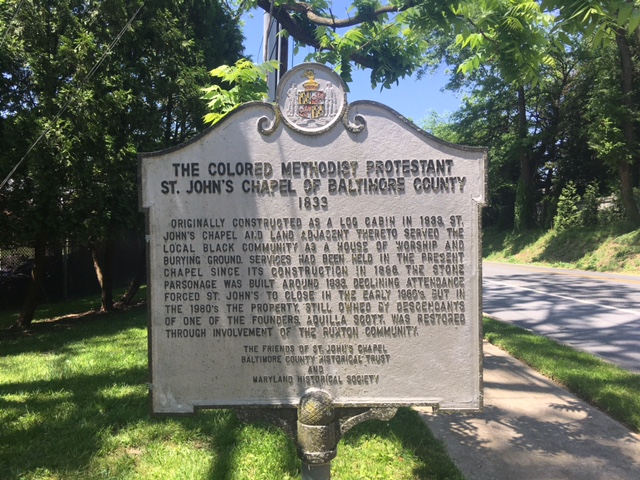 Pictured above are exterior and interior photos of the second St. John’s Chapel, built in 1886 under the direction of Rev. Edward Scott, a son of Rev. James Aquilla Scott. It is located just up the hill some from the site of the original log chapel where both enslaved people and freemen worshipped. (It burned down in 1876.) The third photo is of the chapel’s historical marker along Bellona Avenue. St. John’s was first named Bethel Episcopal Methodist Religious Society. On the Maryland Historical Trust website, it’s described as “a frame Gothic Revival gable-roofed structure with board-and-batten siding, stylized lancet windows, and Queen Anne decorative detailing, including fishscale shingles in the gables.” Two potbelly stoves provided heat, and interior lighting was mostly by three kerosene chandeliers raised and lowered through eyebolts in the ceiling. The chapel was listed on the National Register of Historic Places in 1982 at the height of restoration efforts shepherded by area residents.