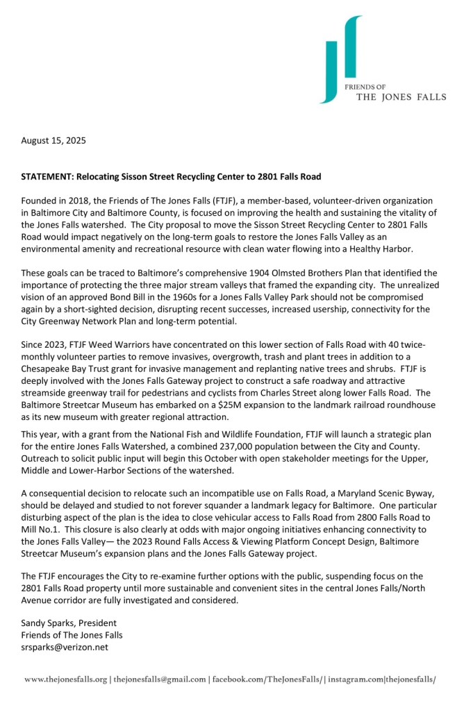 STATEMENT: Relocating Sisson Street Recycling Center to 2801 Falls Road Posted byfriendsofjonesfallsAugust 15, 2025January 20, 2026Posted inCommunications/Letters from the Board President, Stewardship Share this: Share on X (Opens in new window) X Share on Facebook (Opens in new window) Facebook Like Loading... Related